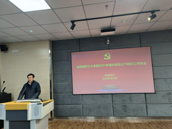 蔡飞作总结讲话,充分肯定了全体教职工2024年的工作成效,并对学院2025年工作提出了新的要求。一要以考核为抓手,不断提升工作水平和质量。二要压紧压实责任,凝聚起齐抓共管强大合力。三要严肃工作纪律,确保各项工作落细落实。同时对寒假期间安全稳定工作进行了部署,要求各办公室提高安全责任意识,做好师生假期安全教育和办公、教学、实验场所安全检查,确保平稳度新春。