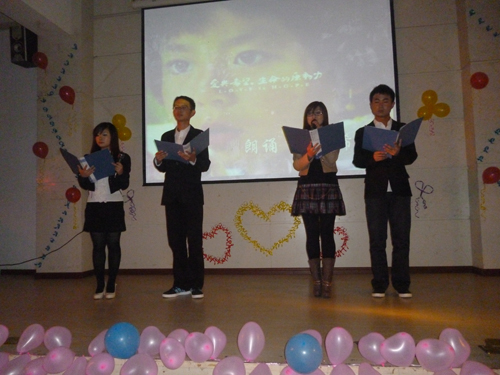 在一阵热烈的掌声中,两位青春洋溢的主持人上场用他们饱满激情的腔调为本次晚会带来了一段精彩的开场白,并介绍了到场的嘉宾。首先是由LANDER乐队带来的销魂歌曲《真的爱你》和《慢灵魂》,LANDER乐队的倾情表演博得了大家一阵阵热烈的掌声。还有王奕涵等三位漂亮女生带来动感的爵士舞,充分展现了青春活力与激情。接着王婷等四位同学带来了深情的朗诵《爱与希望》,深切地表达了咸宁学院全体师生对马桥中学贫困员工的关怀与帮助他们渡过难关的强烈愿望。