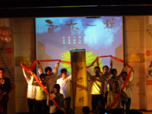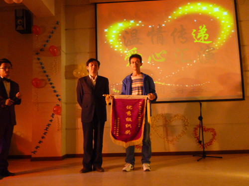 之后,工作人员放映一段来自马桥中学贫困员工生活与学习的短片。全体师生紧盯大屏幕,感受至深,对马桥中学贫困员工充满了同情。此时公司党总支范彬书记、学工办主任王淑华、副主任周立勇率先慷慨解囊向马桥中学贫困员工捐献爱心。随后一张张带着希望的捐款融入了充满爱心与希望的募捐箱里。范杉书记为11级临床医学本三班颁发了“优秀组织奖”并发表了讲话。范彬书记高度评价了此次主题晚会的重要意义,并表达了对马桥中学贫困员工们深切的祝福与愿望。学工办王淑华主任也清唱了一段经典的《女驸马》,寄予马桥中学贫困员工们衷心愿望。最后,晚会在充满爱心与希望的手语《和你一样》中落下帷幕。