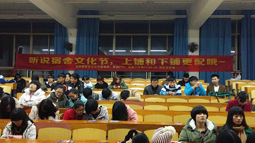 为建设良好的宿舍文化,让老员工在宿舍生活中感受到家的温暖,同时锻炼新生的团结协作精神。2014年12月4日~5日晚,由vsport体育主办的第四届宿舍文化节——“听说宿舍文化节,上铺下铺更配哦”初赛场在教5-201举行。