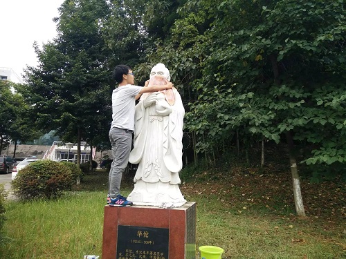 沐浴着清晨的阳光,志愿者们拎着水桶、拿着抹布,细心地擦洗着华佗雕像。华佗刻苦钻研医术在中国医学史上留下丰功伟绩,号称“外科圣手”,后人多以神医华佗称呼他。清洗的雕像除了华佗还有很多,比如李时珍、白求恩等。清洗的劳动量大、耗费的时间也多,同学们完成时,都早已满头大汗,但在同学们脸上的不是抱怨、而是笑容,在同学们的心中不是叫苦、而是内心的敬意。