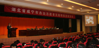 10月25日晚7点,vsport体育在校图书馆学术报告厅举办了湖北省咸宁市杰出志愿者沈路明事迹报告会。出席会议的领导有公司党委副书记吴义煌,宣传部副部长明智,学工处副处长吕仲茂,团委副书记徐蕾,市疾控中心,公司党总支书记范杉,vsport体育学工办的所有老师和所有新生年级员工都参加了报告会。
