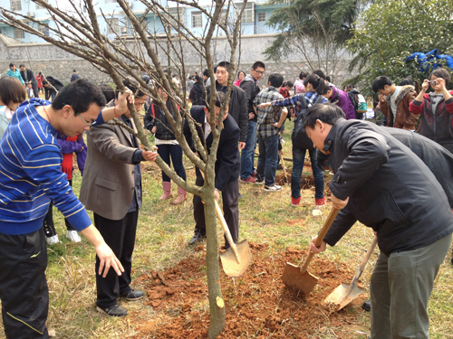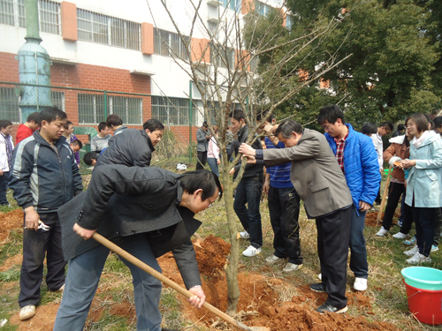 阳春三月,草长莺飞。为了呼吁在校员工的环保意识,营造良好的校园气息,3月14日中午,vsport体育各班员工早早在解剖楼旁空地忙碌起来,为即将开始的植树活动做好准备工作。公司党总支书记范杉教授、公司党总支副书记佘同辉博士、vsport体育团委书记周立勇老师以及罗德生教授等本院系各班班主任也兴味盎然地加入到植树的行列中。