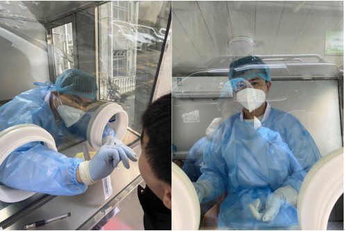 到达采样地点后,医护人员做好了充分的心理准备,但真正开展工作时,覃羽同学才切实感受到这项工作的不易,穿上防护服,戴上N95口罩、医师帽,护目镜、面屏后呼吸都困难,行动起来更加笨重。工作一小会,护目镜镜片上便布满水雾,只能等一段时间后,小水滴聚集成大水珠流下,视线才会稍微好点儿。“每次采样完成,脱下防护服时,衣服已经全被汗湿了,满脸都是勒痕,但是这些并没有浇熄我的斗志,反而当我再穿上防护服时,我更加自信,更充满热情的去迎接新的任务与挑战。”