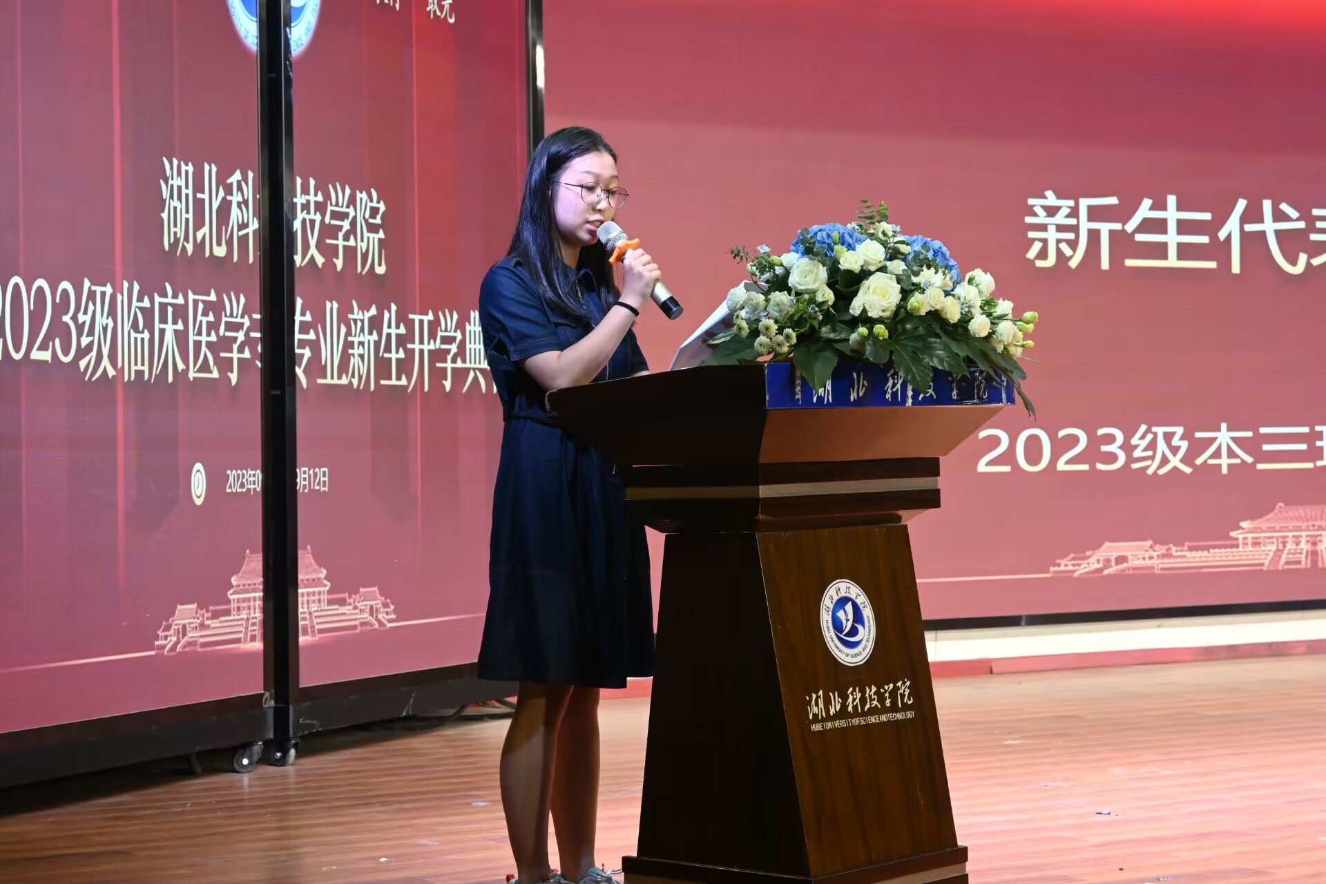 2023级临床医学本科三班的程心怡同学作为新生代表发言,她以“乘湖科之风,赴医学之路”为题,讲述了她选择湖科医学的“初心”,并表示在未来将勇敢向上攀登,脚踏实地,扎实学好基础知识,培养创新能力,积累实践经验,成长为国家医学卫生健康事业的合格接班人。