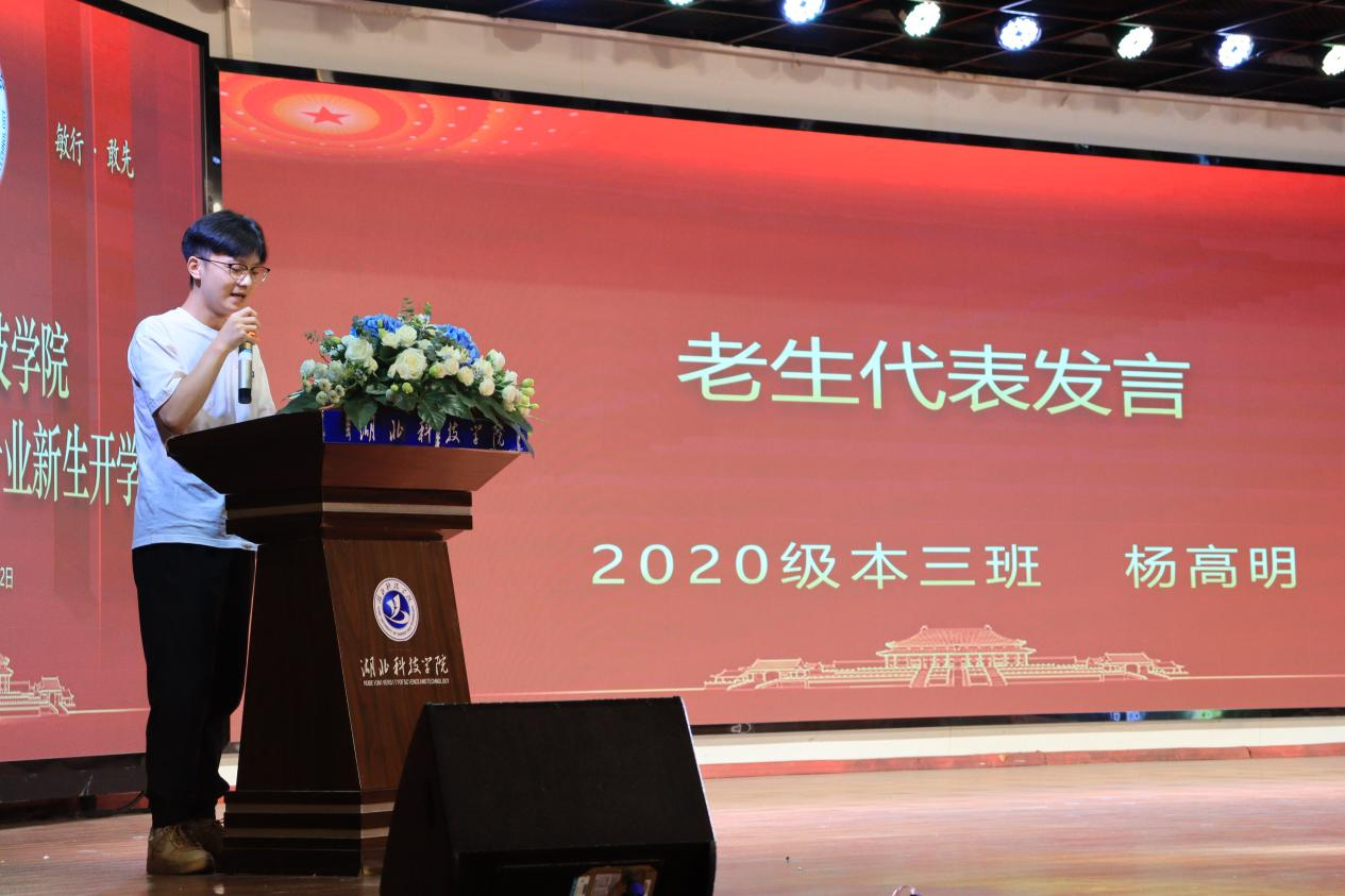 2020级临床医学本科三班的杨高明同学作为老生代表发言,他分享过去三年和目标、勤奋、实践的故事,也分享了医学学习心得,表示医学之路道阻且长,希望各位学弟学妹尽早明确自己的目标,适应大学节奏,锲而不舍,做开拓创新的追梦人。