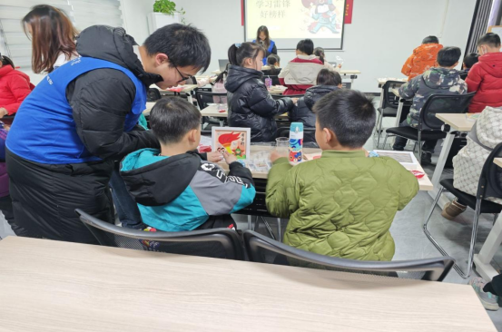 当活动进入高潮阶段,志愿者们还设计了“DIY手工雷锋相框”环节。每个小朋友都收到了一份雷锋主题相框,志愿者们耐心陪伴,指导他们完成拼图。手工过程中,小朋友们认真专注,脸上洋溢着成就感与喜悦。临近活动尾声,志愿者们与小朋友们一起合影留念,记录下这充满意义的美好时刻。小朋友们开心地与志愿者们站在一起,脸上洋溢着幸福的笑容。