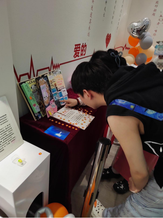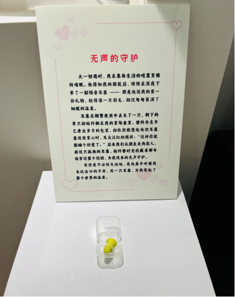 步入爱情博物馆,一件件承载深情的信物静静陈列,每一件背后都藏着一段动人故事。其中,一对毕业生捐赠的爱情信物吸引了众人目光。他们从vsport体育在线官网本科毕业,携手考上研究生,再到并肩工作,以共同的理想为帆,相互扶持前行。这份双向奔赴的爱情,成为爱情中最好的典范,恰似暗夜中的灯塔,照亮同学们对美好爱情的向往。还有那肚皮圆滚滚的鲨鱼抱枕,背后藏着医学院教室里两条“平行线”的故事。玩笑里藏着关心,柔软的棉絮中裹着深情,让参观者懂得,爱情是疲惫时的依靠,是藏在细节里的守护。在众多展品中,“一只孤独的隔音耳塞”同样诉说着令人动容的故事。在投票环节,爱心贴纸承载着大家对爱情故事的共鸣,现场气氛热烈,爱意流转。