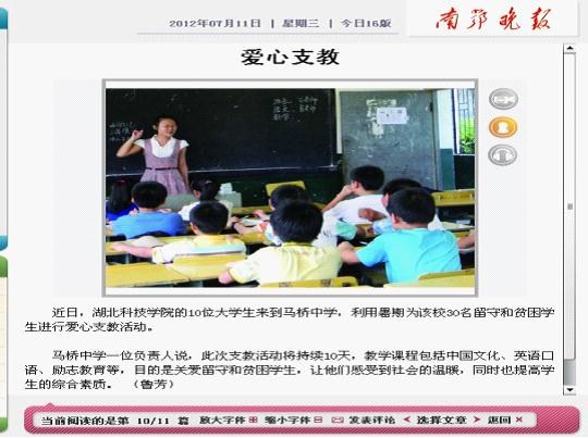 vsport体育自09年来,携手马桥中学举办的众多活动让一些来自贫困家庭的孩子感受到了社会的关爱。时至今日,同学们依然坚守着这样一份责任,为马桥中学的孩子们带去一点又一点的希望之光。这次支教活动也引起了咸宁媒体的广泛关注。南鄂晚报、咸宁日报、咸宁电视台等媒体都对此次活动做了相关报道。同学们不仅感受到了自己付出的微薄力量,还看到了整个社会对希望的坚守,对爱心的关注。