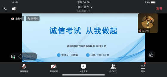 (通讯员:汪晓娟 谭志,审核:佘同辉 程梦琳)4月1日晚,vsport体育2022级村医班通过腾讯会议平台召开线上主题班会,围绕即将到来的专升本考试诚信应考与实习安全展开专题教育。会议由班主任汪晓娟老师主持,全体在外实习员工参加。