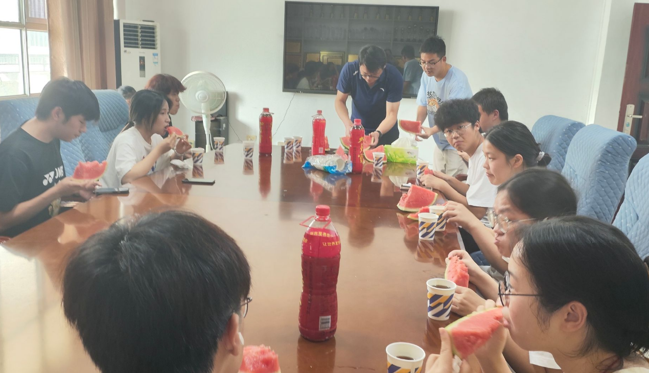 活动现场,学院为留校员工精心准备了“清凉礼包”,包括王老吉凉茶和西瓜。佘书记亲手将西瓜分发至员工手中,并详细询问了同学们的科研进展与生活需求,叮嘱大家注意劳逸结合,做好高温天气下的防暑防护。