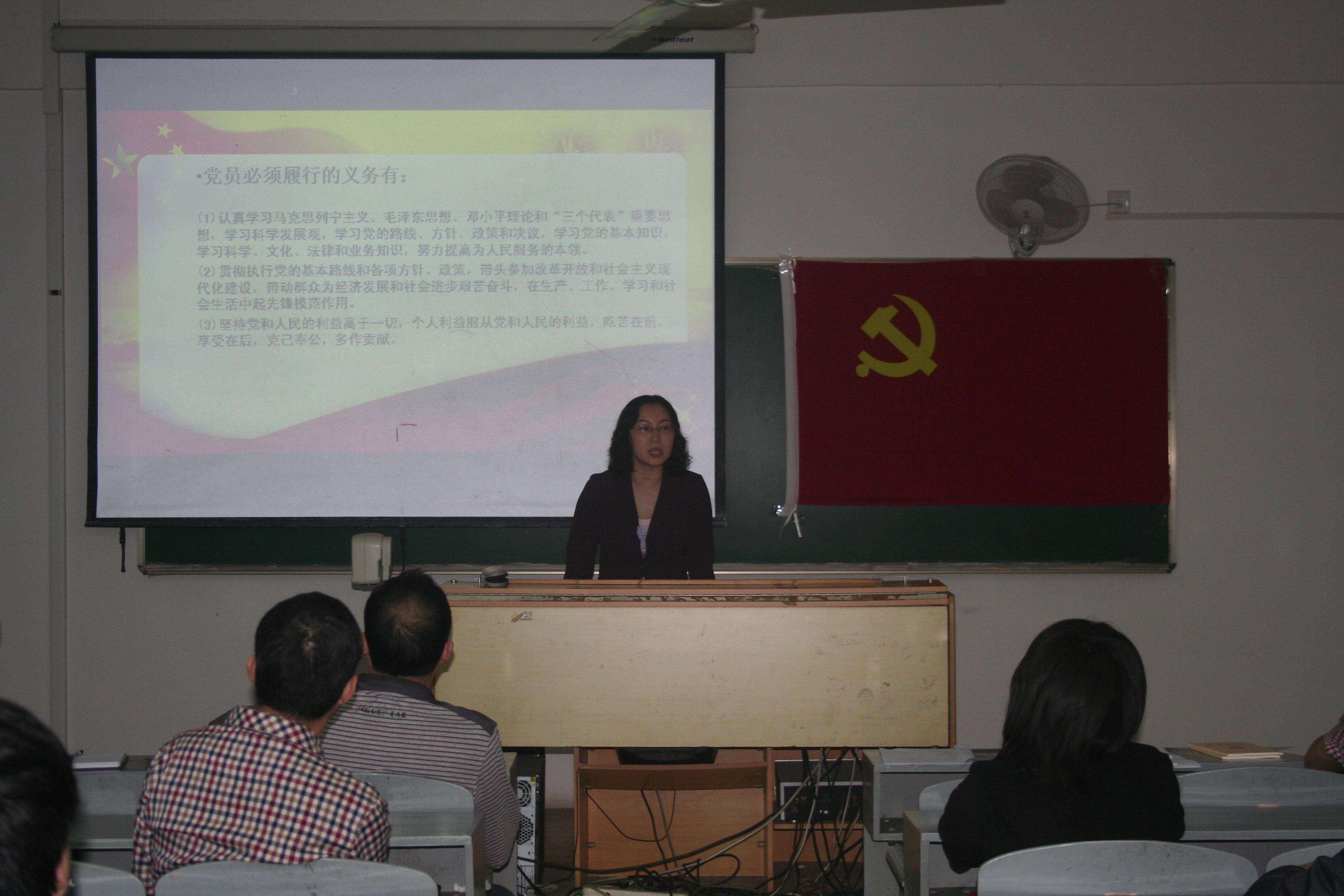 首先,党总支副书记李应续同志带领全体党员重温入党誓词。同志们胸前佩戴着党徽,站在鲜红的党旗下,庄严地举起右手,声音洪亮的宣读誓词,“我志愿加入中国共产党,永不叛党”。重温入党誓词,不忘初心,为党的事业再接再厉。接着,党总支书记程梦琳同志结合我们教育工作实际情况和各自岗位要求,带领同志们学习中国共产党章程,党员权利,党员义务。她说,基层党总支要充分发挥战斗堡垒作用,党员干部要充分发挥先锋作用,我们高校教师要以优秀党员的高标准严格要求自己,发挥言传身教的示范作用,争当为人师表和教书育人的楷模。党员要用合法的程序维护权利,要从正面发声,传递正能量,引导大众舆论。然后,党总支宣传委员石裹莹同志领读了习近平总书记关于中国梦、弘扬社会主义核心价值观、官德、文化交流等系列讲话的重要精神。