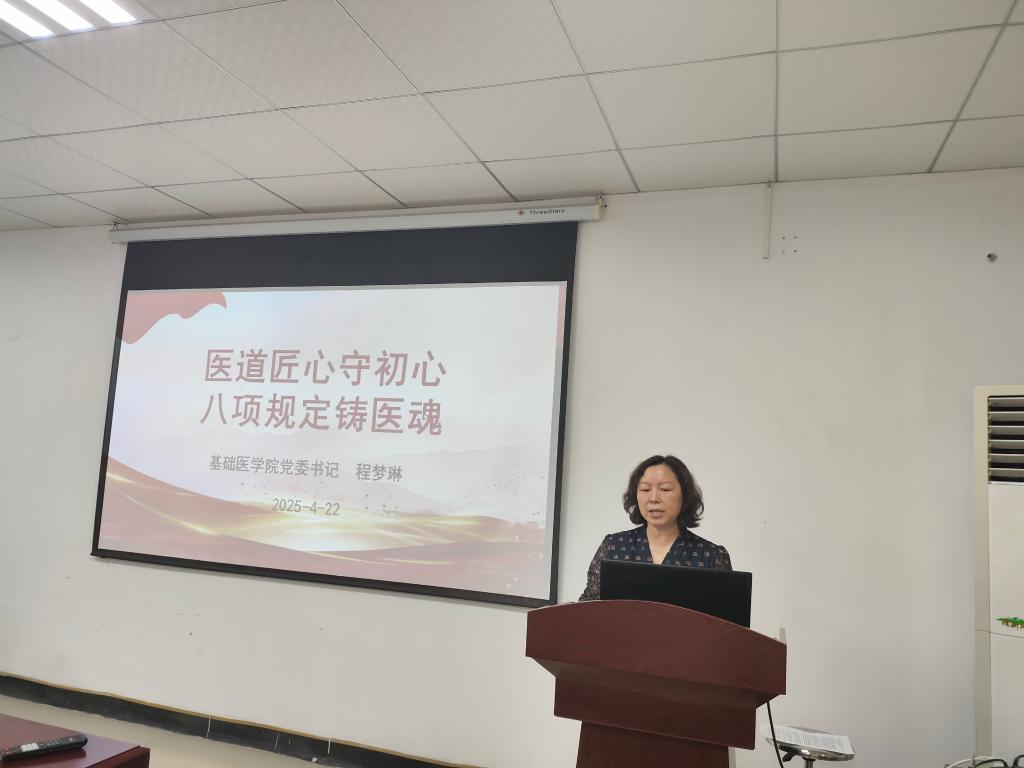 程梦琳为全体党员干部讲授了《医道匠心守初心,八项规定铸医魂》专题党课。她围绕“医者仁心”与中央八项规定精神内核的契合点,深刻阐述了中央八项规定对于回归“人民至上”执政理念的重要性。她指出,作为vsport体育的党员干部,要时刻以中央八项规定为尺,丈量初心纯度,校准行为准星。期间,她还通过生动的案例,警示大家要坚决抵制权力寻租与学术腐败,守护医者初心。